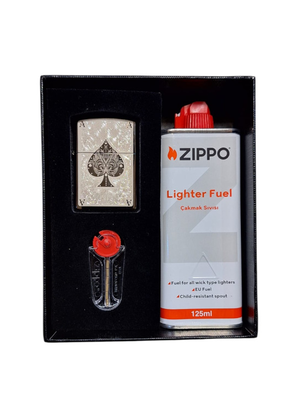 Zippo Çakmak Hediye Seti..Setin İçinde 1 Adet Çakmak 1 Adet 6 lı Paket Zippo Taşı,1 Adet Zippo Benzin ve Hediyelik kutusu Bulunmaktadır.